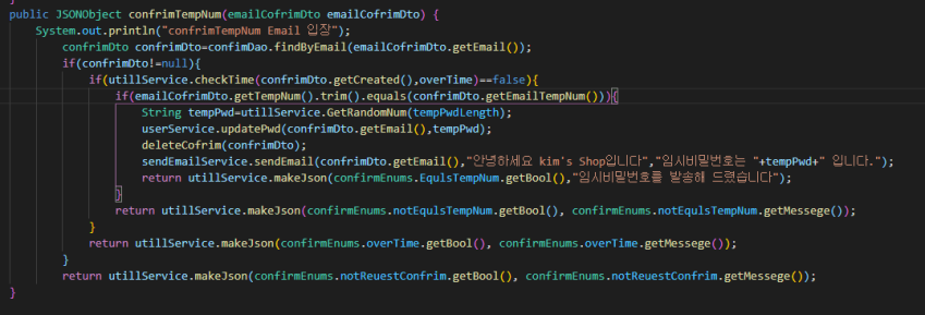 sendEmailService.sendEmail(confrimDto.getEmail(),"안녕하세요 kim's Shop입니다","임시비밀번호는 "+tempPwd+" 입니다.");