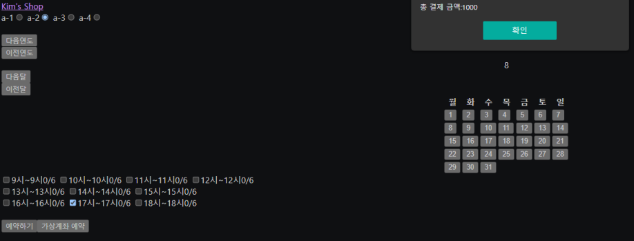 자리 선택-> 시간선택-> 가상계좌-> 검증-> 계좌발급-> 임시 예약 완료-> 입금 확인-> 예약 완료