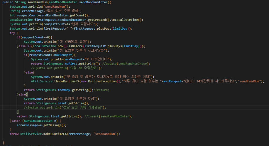 utillService.throwRuntimeEX(new RuntimeException(),"하루 최대 요청 횟수는 "+maxReuqest+"입니다 24시간뒤에 시도해주세요", "sendRandNum");