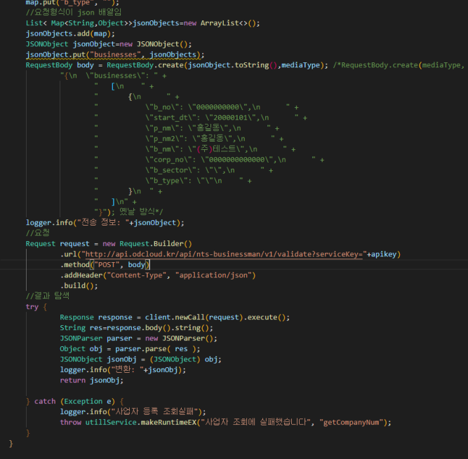 국세청에서 제공하는 사업자등록정보 진위확인 및 사업자등록 상태조회 API 서비스입니다.