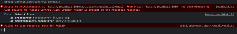 localhost/:1 Access to XMLHttpRequest at 'http://localhost:8080/auth/user/check? detail=email' from origin 'http://localhost:3030' has been blocked by CORS policy: No 'Access-Control-Allow-Origin' header is present on the requested resource.