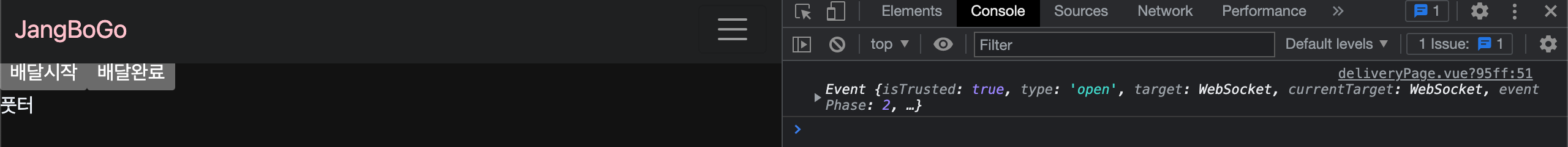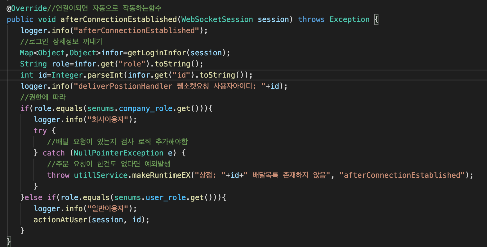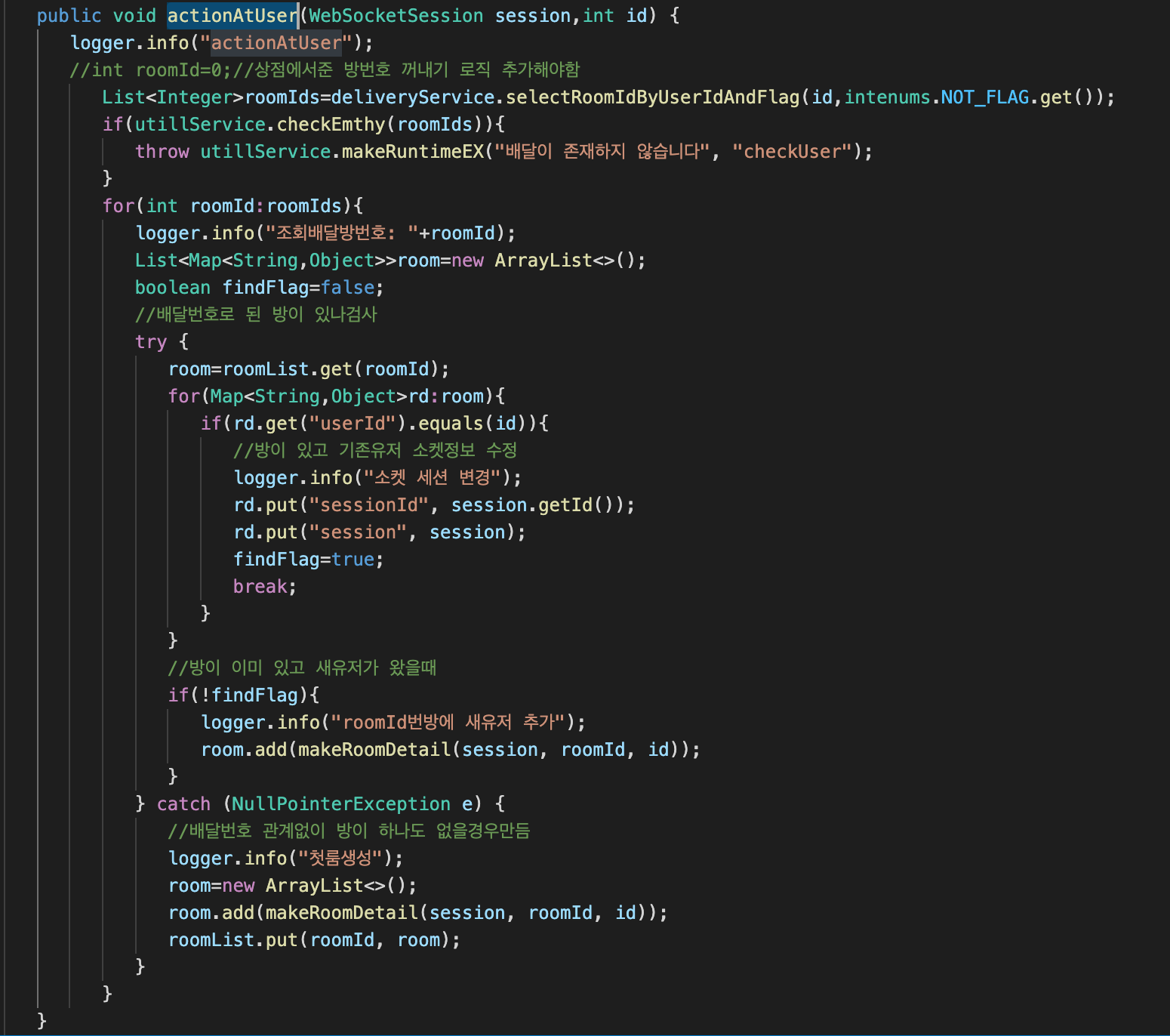 배달요청(손님)->물건 픽업 완료 클릭-> 요청 db에 배달 방 번호부여(사장님) 배 달방 생성-> 배달 시작 버튼 클릭(사장님)->웹소켓 연결