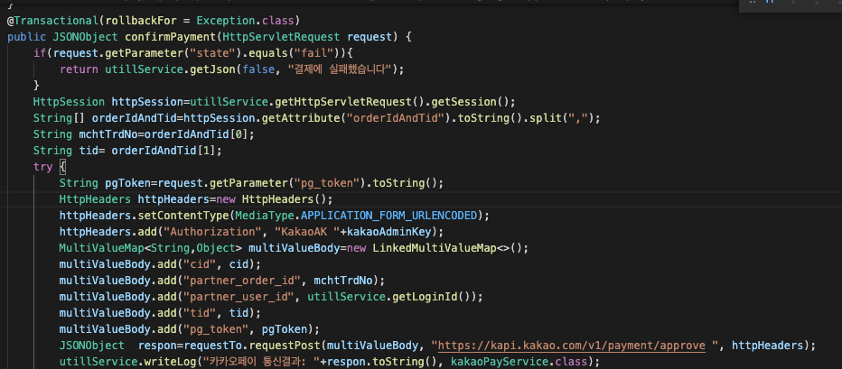 JSONObject respon=requestTo.requestPost(multiValueBody, "https://kapi.kakao.com/v1/payment/approve ", httpHeaders);