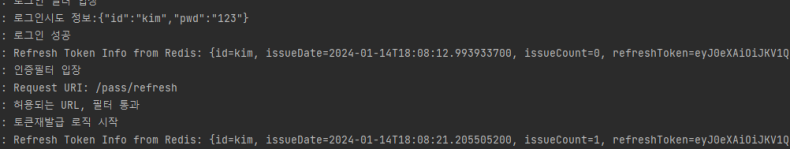 // 레디스에 저장된 리프레시 토큰 정보가 있는 경우 로그 출력