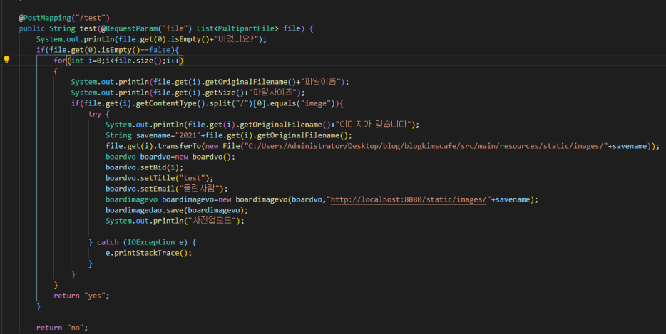 file.get(i).transferTo(new File("C:/Users/Administrator/Desktop/blog/blogkimscafe/src/main/resources/static/images/+savename));