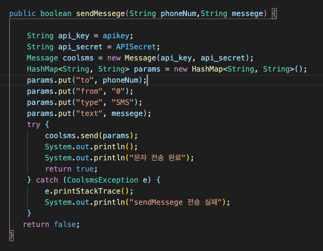 if(coolSmsService.sendMessege((String)phone.get("phone"), smsRandNum))