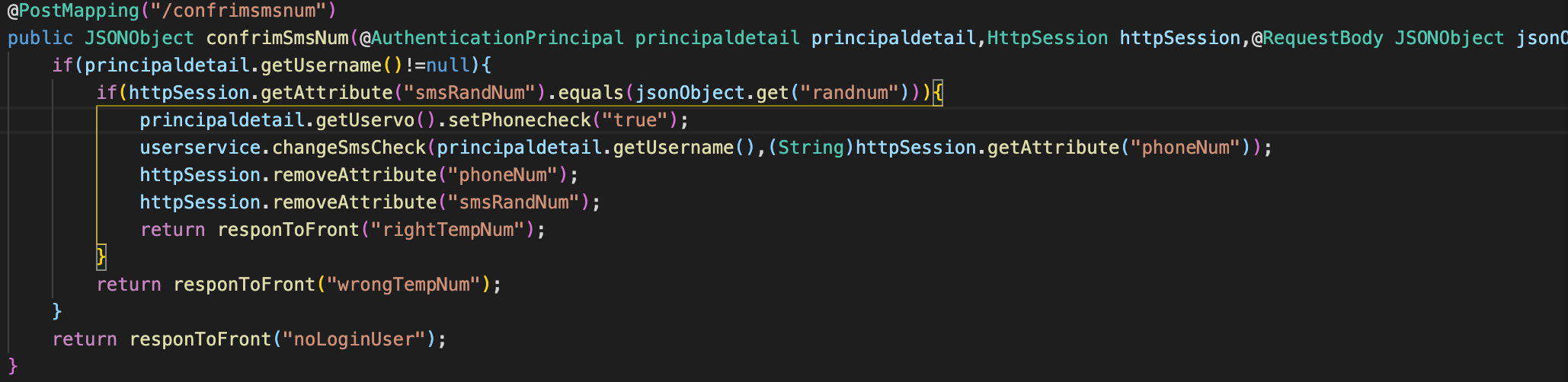 userservice.changeSmsCheck(principaldetail.getUsername(),(String)httpSession.getAttribute("phoneNum"));
