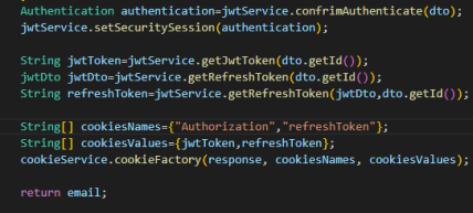 1.jwt서비스에 토큰 오픈 코드 작성 public String getValue(String jwtToken){ try { // JWT 검증을 위한 알고리즘 설정 Algorithm algorithm = Algorithm.HMAC512(jwtSecret); // JWT 검증기 생성 JWTVerifier verifier = JWT.require(algorithm).build(); return verifier.verify(jwtToken).getSubject(); } catch (Exception e) { // 토큰이 유효하지 않거나 디코딩에 실패한 경우 e.printStackTrace(); log.error("토큰이 유요하지 않습니다"); return null; } } 2.인증필터 작성 @Override p..