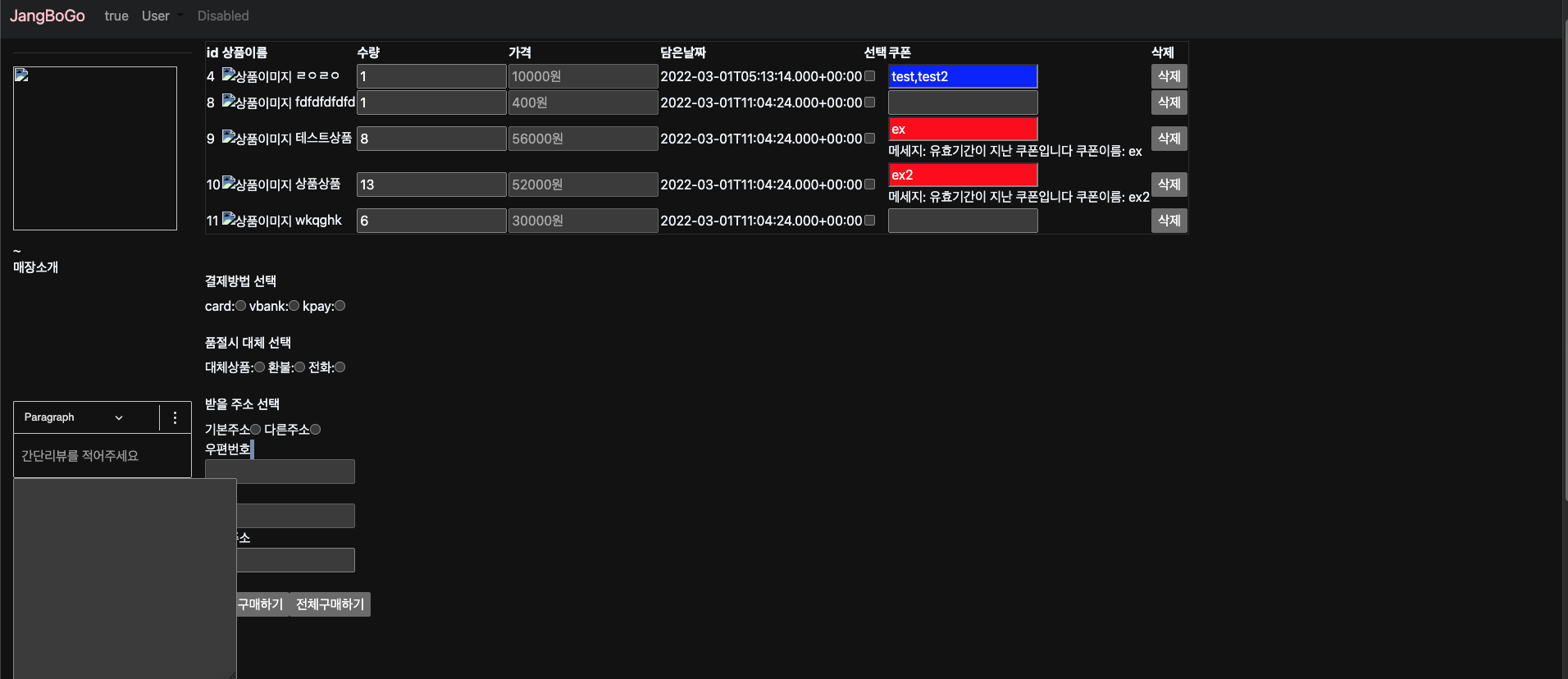 미완성 사이드바가 가리긴 하는데 일단 전략을 바꿨다 구축하고 리팩터링 하는 걸로 그리고 애초에 장바구니에서 주문이 되는게 아니라 결제 페이지가 있어야하는데 일단 한꺼번에 만들었다 1. 수량조절 장바구니 고유 id값을 전달해 준다 요청받은 id/개수를 서버로 준다 서버 장바구니 id로 조회 basketVo basketVo=basketDao.findById(basketId).orElseThrow(()->utillService.makeRuntimeEX("존재하지 않는 장바구니 품목입니다", "tryUpadte")); 업데이트 basketVo.setCount(count); 가격 재계산 ((productVo)productService.getProduct(basketVo.getProductId()).get("mes..